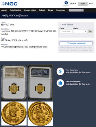 過去の海外オークション実績でも、ホノリウス帝ソリダスは